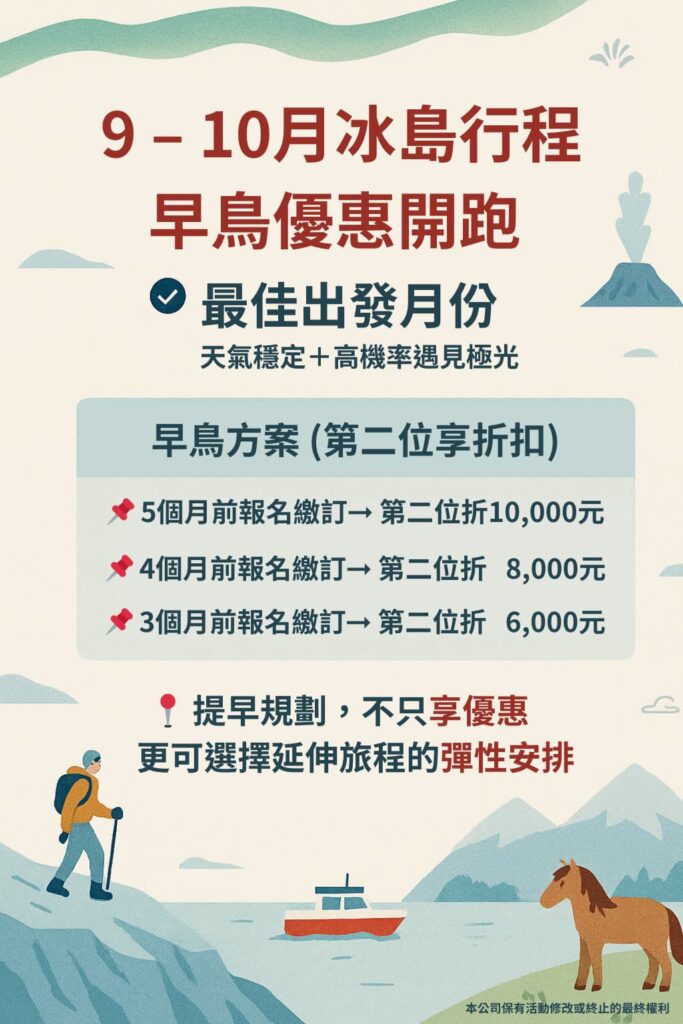 9-10月冰島行程早鳥優惠開跑!提早報名第二位最高現折10,000元。