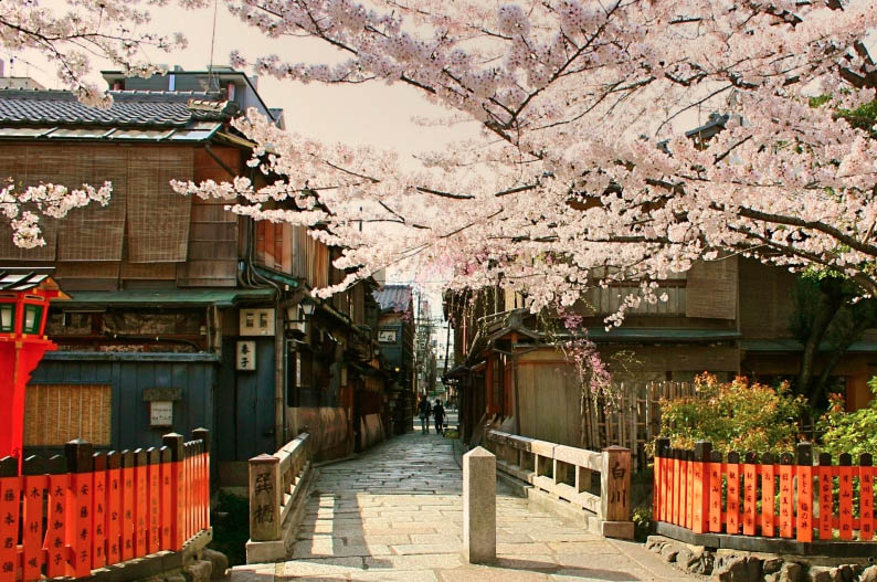 穿和服漫步於京都古老街道 , 迎風走向櫻花吹雪之秘境 ,