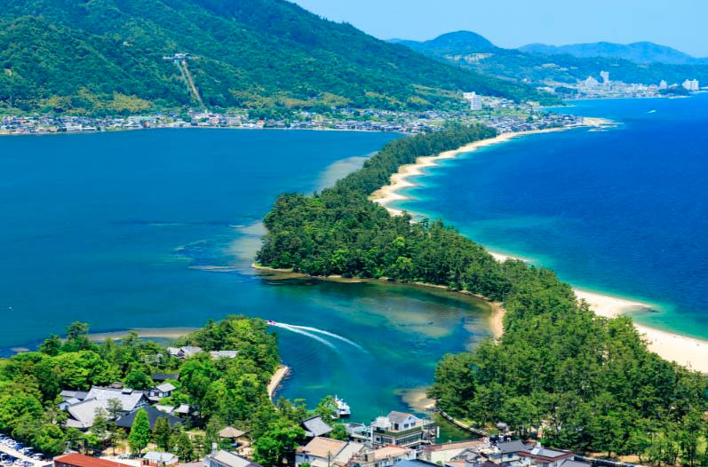 「天橋立」是日本絕美三景之一,有著自然成形、被視為天上神明往來人間的沙洲道路。到當地老街來趟散策之旅,包含供奉「日本三大文殊菩薩」的智恩寺,然後行經「智慧之輪燈籠」,沿著河道前行至迴旋橋,最後抵達山頂的飛龍展望台,俯瞰天橋立將發現沙洲呈現S形綠色巨龍,好像飛騰在天一般。