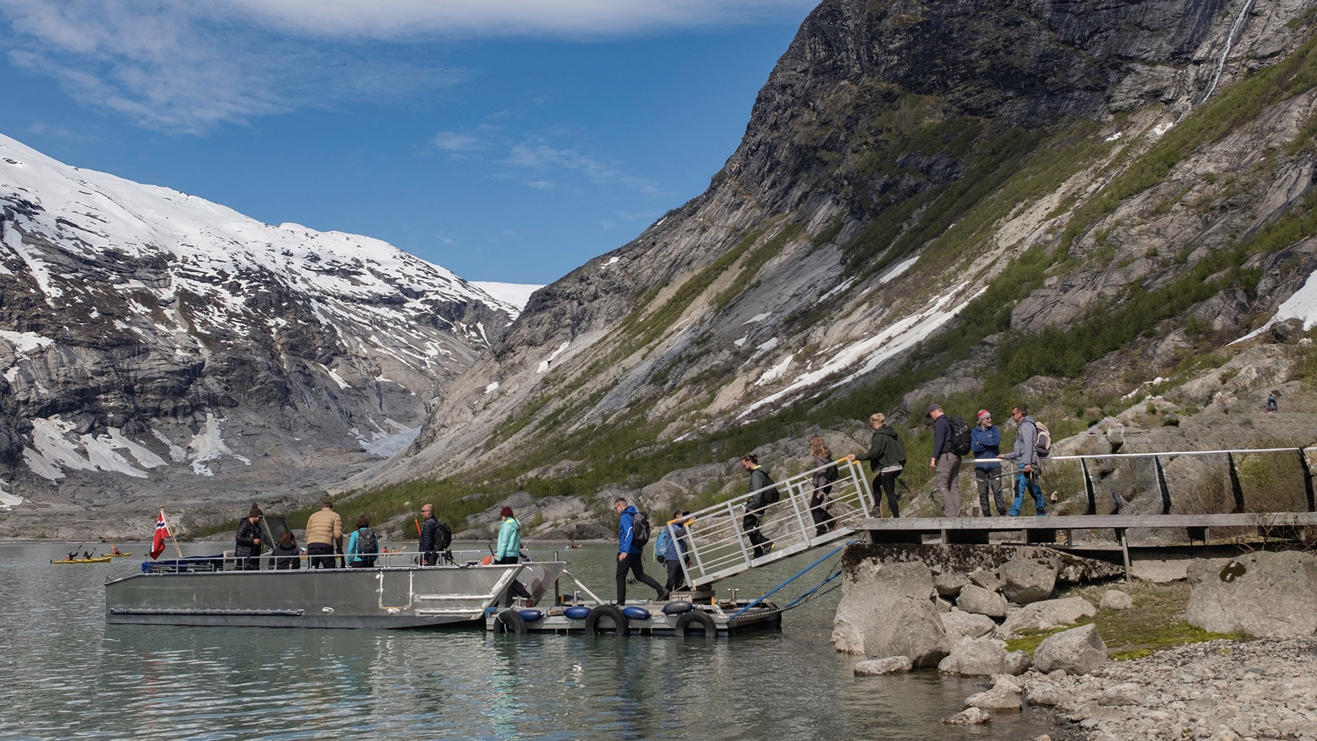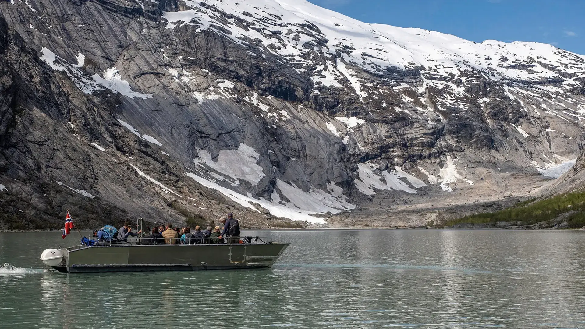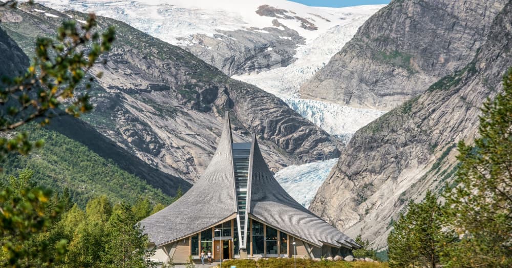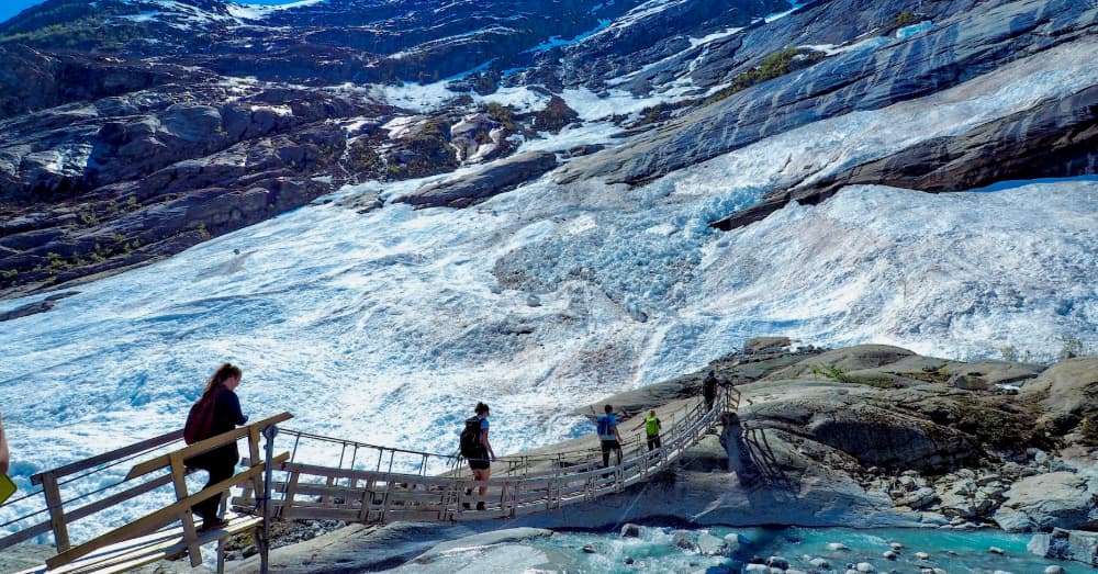 布利斯達爾冰河(Briksdal Glacier)因全球暖化影響,近年冰層大幅退縮,如今僅能在山谷遠處看到細長的冰舌殘影。
