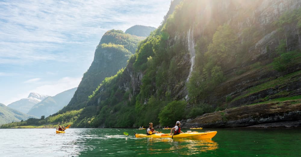 旅行不該只是走馬看花! 今日獨家安排深度自選行程:可在教練帶領下划行獨木舟暢遊松恩峽灣水道 或 自駕小船遊覽山壁與水色交織的峽灣景觀,也可選擇跟隨導遊健行私藏景點的峽灣瀑布觀景平台,輕鬆的步道,景致層疊有序,值得一探。